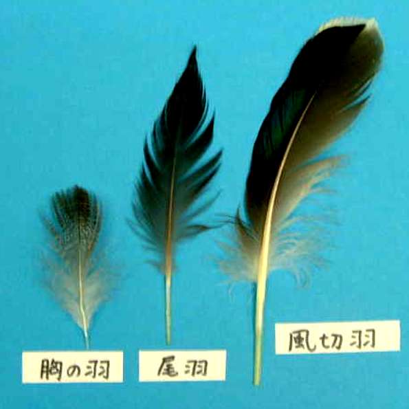 尾羽は,その名の通り,尾に生えているしっぽ羽です。尾羽はまっすぐの物が多く、羽軸は丈夫でしっかりしています。尾羽の役割は、方向舵とか飛行機で言うと尾翼だと思われます。飛んでいる時,風を後ろに流して体を安定させたり,着地の際に尾羽を立ててブレーキをかけたりしています。尾羽を紙飛行機のように飛ばしてみると,他の羽よりもすっと真っ直ぐに飛んでいきます。